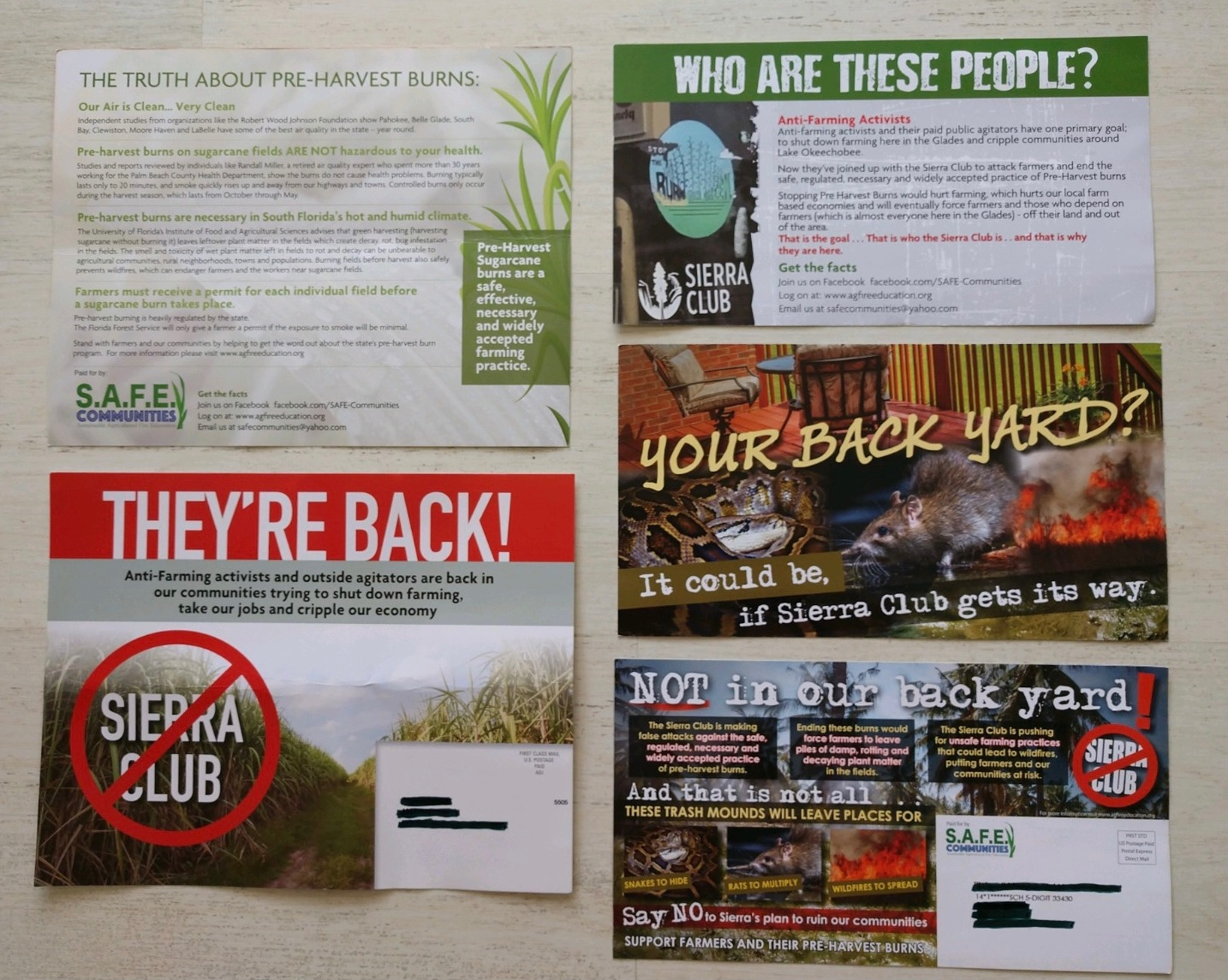 “Stopping Pre Harvest Burns would hurt farming, which hurts our local farm based economies and will eventually force farmers and those who depend on farmers (which is almost everyone in the Glades) – off their land and out of the area,” one mailer read. The sugar industry is the largest employer in the Glades, providing more than 12,000 jobs during the six-month harvest season.