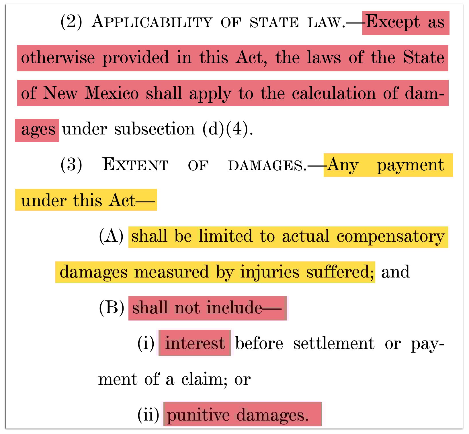 The memo says the federal law establishing the compensation fund bars noneconomic damages through that phrase: “limited to actual compensatory damages.” It notes that noneconomic damages weren’t paid after the Cerro Grande Fire.