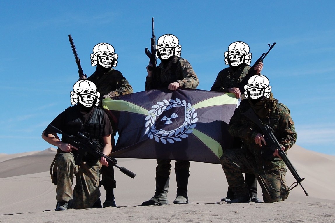 When the group got out to the desert, Hubsky made sure they shot photos and videos to be used in Atomwaffen recruiting clips. In one picture obtained by ProPublica, an Atomwaffen member is standing at the base of a sand dune showing off a military-grade weapon — an MCX Virtus rifle made by Sig Sauer — while holding a flag bearing the Atomwaffen insignia, a black shield bearing the symbol for radioactivity. Another member, clutching an assault rifle, is also in the photo.
