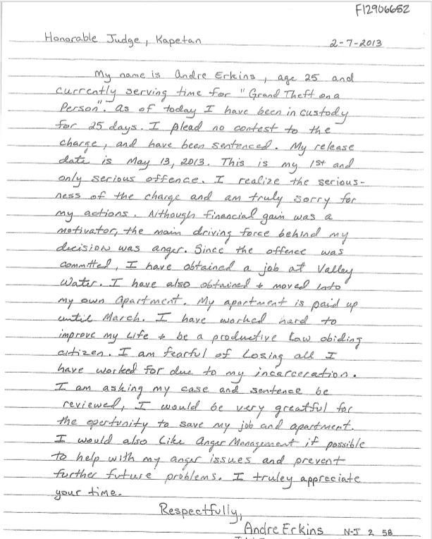 Andre Erkins got into trouble with the law for the first time on Aug. 9, 2012. “While the victim was unloading groceries, Erkins took her purse from her shopping cart,” the arrest report said.