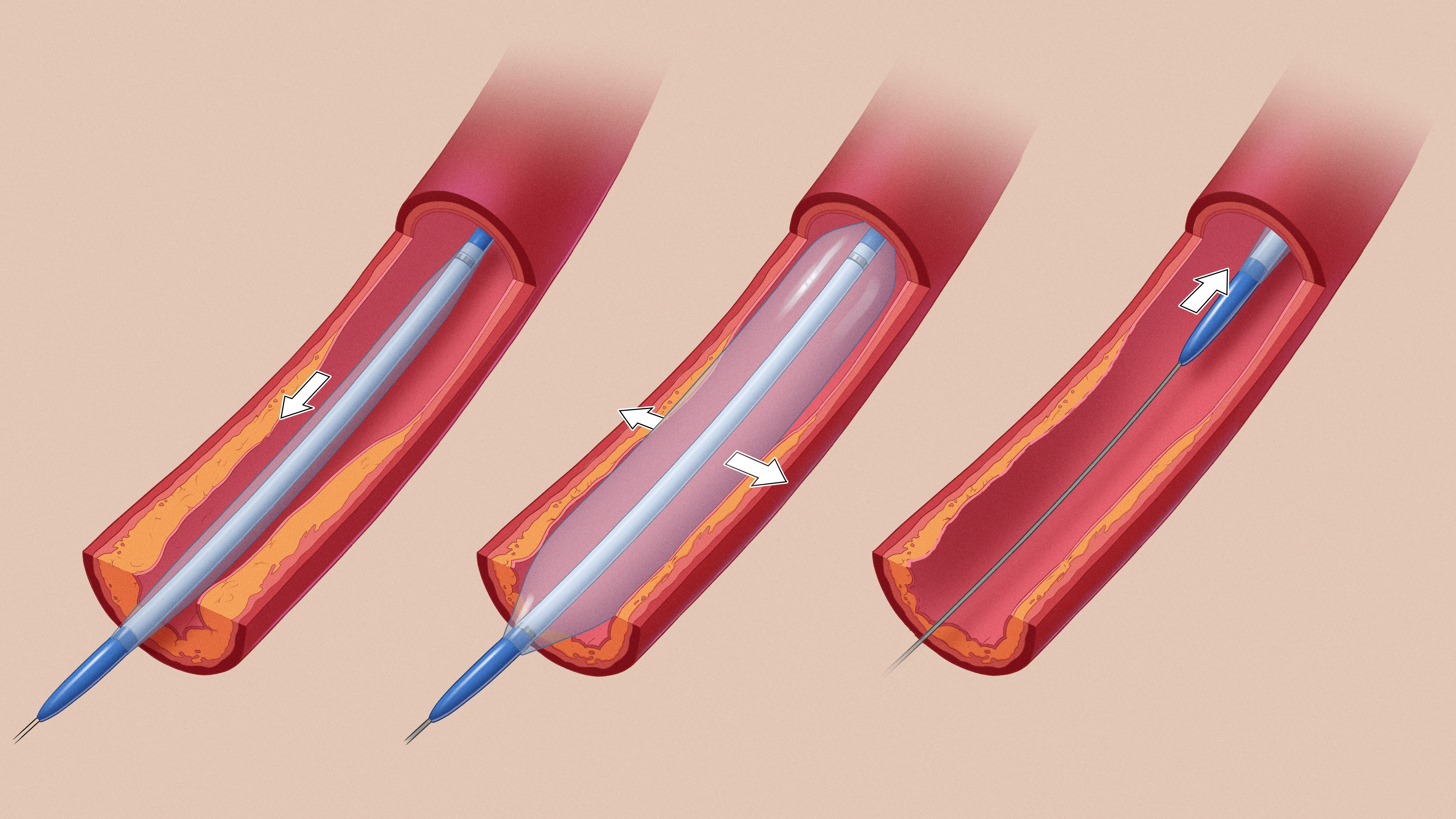 Angioplastia: Se inserta un globo compacto en un vaso sanguíneo y se infla para aplanar la placa contra sus paredes.