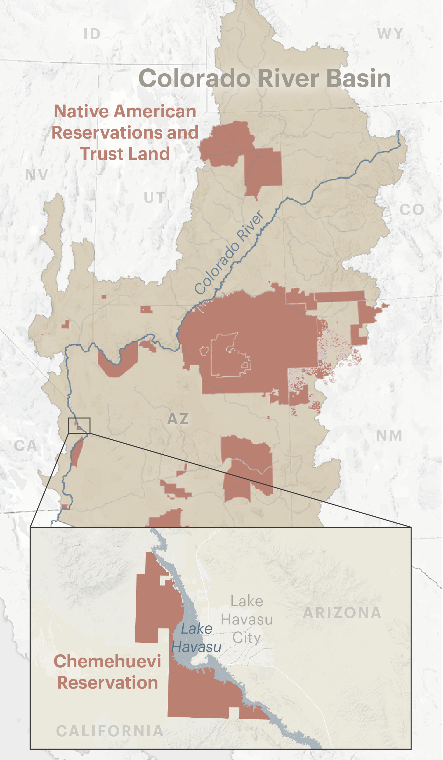 But most of the basin’s 30 federally recognized tribes have faced seemingly endless barriers to accessing and benefiting from all of the water to which they’re entitled. The Chemehuevi’s reservation fronts about 30 miles of the Colorado River, yet 97% of the tribe’s water remains in the river and ends up being used by Southern California cities. The tribe never receives a dollar for it.
