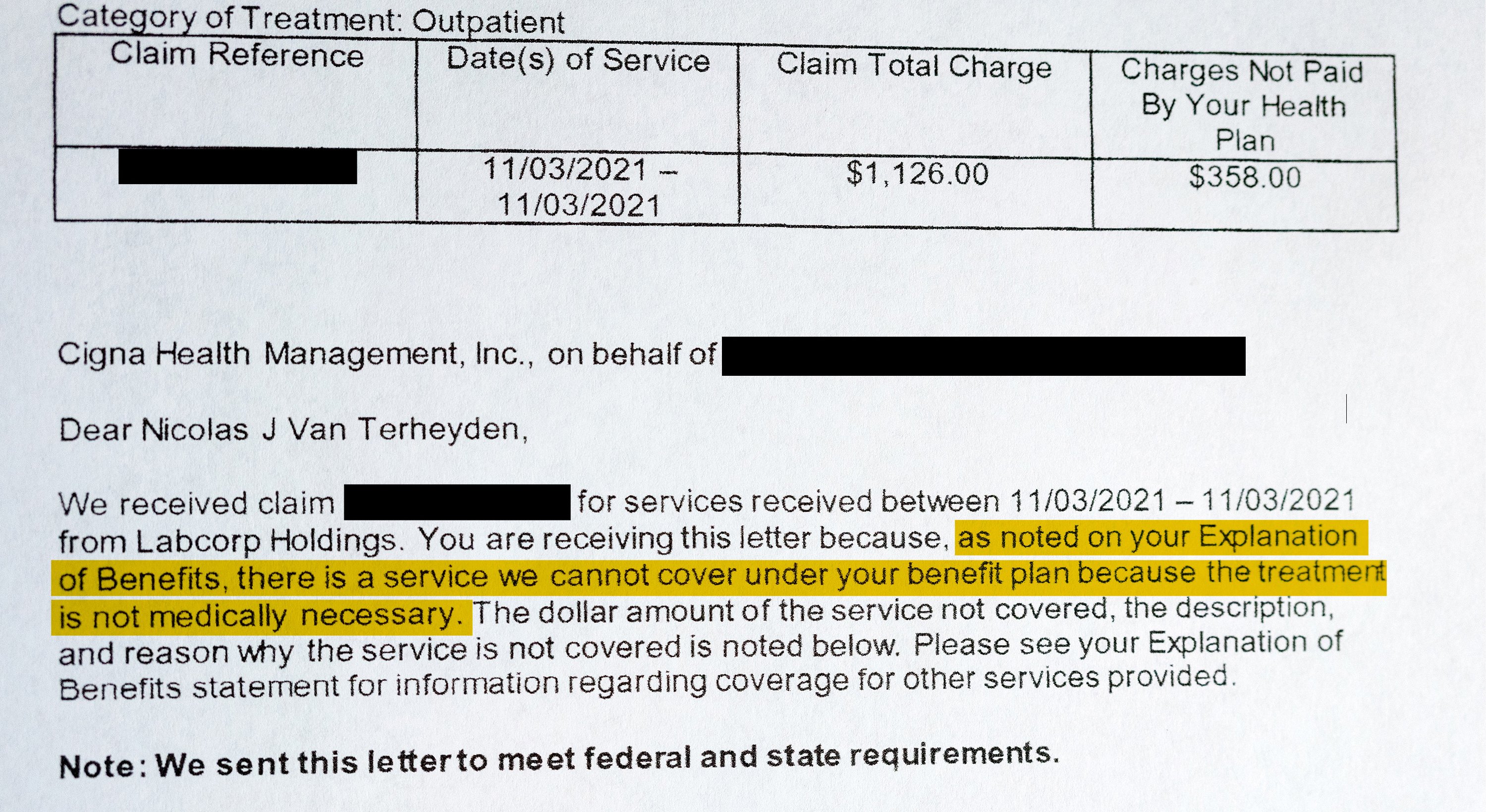 A blood test in the fall of 2021 confirmed the doctor’s diagnosis, and van Terheyden expected his company’s insurance plan, managed by Cigna, to cover the cost of the bloodwork. Instead, Cigna sent van Terheyden a letter explaining that it would not pay for the $350 test because it was not “medically necessary.”