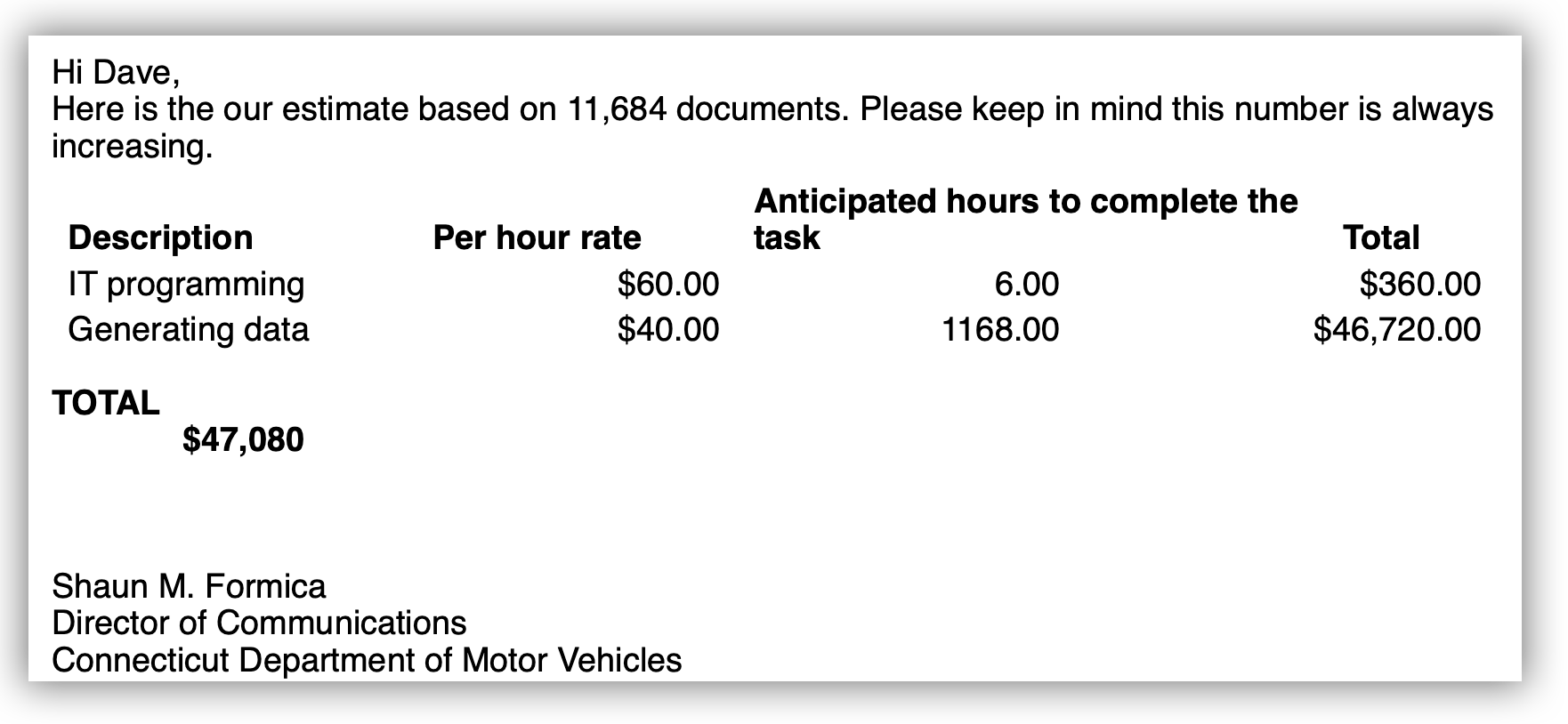 After asking the DMV to produce an itemized accounting of the $47,000 bill, we asked our attorney to appeal to the Freedom of Information Commission. Our attorney negotiated a compromise in April 2023. We agreed to pay $1,900 to cover the agency’s costs of redacting thousands of documents our request entailed.