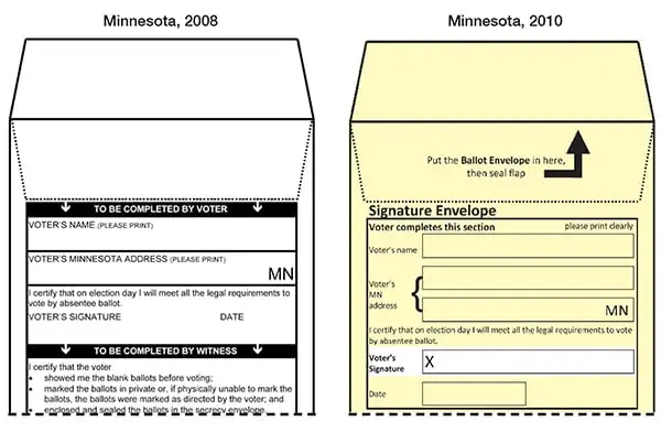 In Minnesota in 2008, Al Franken beat Norm Coleman for the U.S. Senate seat by a sliver, less than 300 votes. In that race, almost 4,000 absentee ballots were not counted because the envelope was not signed. The Minnesota Secretary of State’s office decided to redesign the mailing envelope. After a series of usability tests, they added a big X to mark where people should sign. In the following election in 2010, the rate of missing signatures dropped to 837. Below is the before and after from a Brennan Center report: