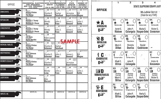 Some of those prescriptions border on the comical. In New York, election law requires that each candidate name must be preceded by “the image of a closed fist with index finger extended pointing to the party or independent row.” Here’s how that actually looks on real New York ballots: