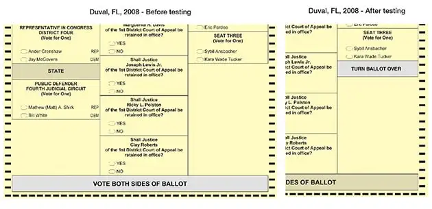 In the predominantly African American city of East St. Louis, the race for United States senator in 2008 was missing a header that specified the type or level of government (Federal, Congressional, Legislative, etc). Almost 10 percent of East St. Louis voters did not have their vote counted for U.S. Senate, compared to the state average of 4.4 percent. Merely adding a header could have solved the problem. Below you can see the original ballot and the Brennan Center redesign.