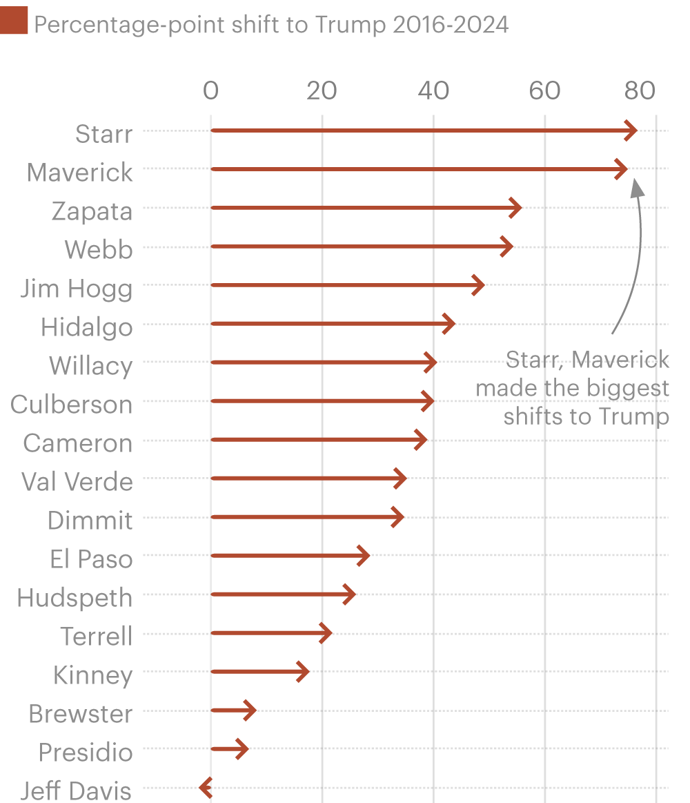 Nine counties within 20 miles of the Texas-Mexico border flipped from supporting Democrat Hillary Clinton in 2016 to Republican Donald Trump in 2024.