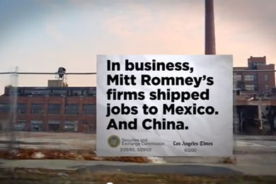 The first focuses on President Obama’s plan for creating jobs, trumpeting an Obama “jobs plan that could put up to a million people back to work.” But in the second variation, Obama’s plan disappears, and in its place is an attack on Romney, saying his plan sends “jobs outside our borders,” and later notes, “there’s a word for people who say one thing and do the opposite.”