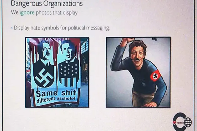 There is also a secret list, referred to but not included in the documents, of groups designated as hate organizations that are banned from Facebook. That list apparently doesn’t include many Holocaust denial and white supremacist sites that are up on Facebook to this day, such as a group called “Alt-Reich Nation.” A member of that group was recently charged with murdering a black college student in Maryland.
