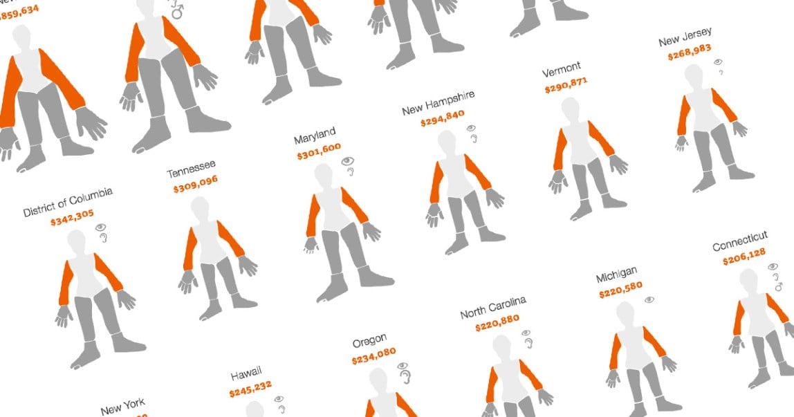 And even if it wasn’t easy for readers to accurately perceive fine differences, we decided that these figures did a great job of conveying the main point: States pay out vastly different benefits for the same injuries. We didn’t need to show the exact dollar amount difference between New Jersey and New Hampshire down to the last decimal point – for that, a bar chart would have probably been the better choice. But we wanted to show the simple absurdity that your limbs are valued differently depending on where you live.