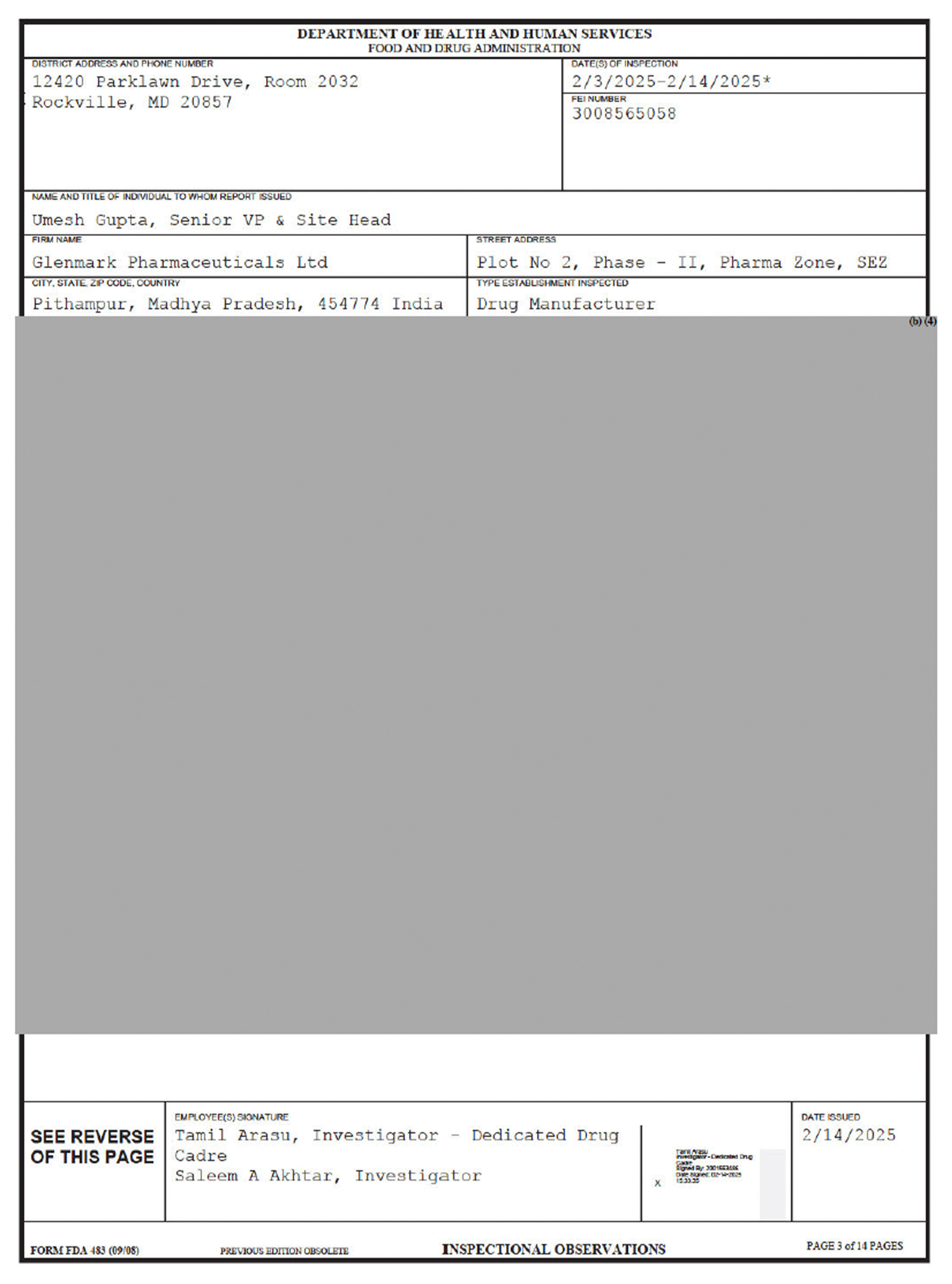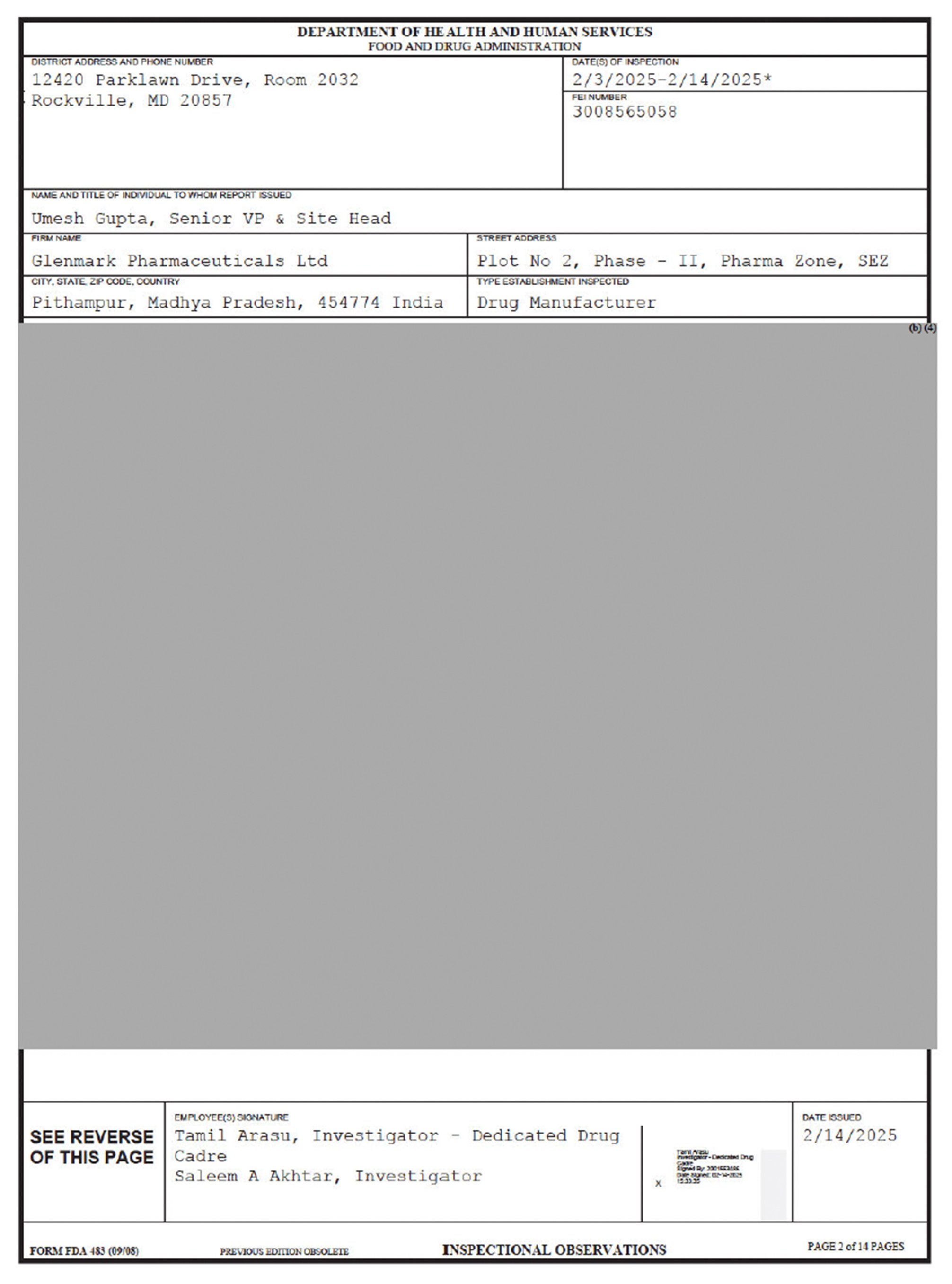 Inspectors visited the factory between Feb. 3 and Feb. 14. Like all such reports, this one notes that the inspectors’ observations “do not represent a final Agency determination” about the company’s compliance with the FDA’s drug manufacturing rules.