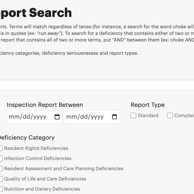 Our new advanced text search features allow users to search for multiple terms simultaneously by separating terms using AND or OR or to search for exact phrases by putting terms in quotation marks. The search also allows users to search for a word like “elope” and automatically see results for other forms of the word, like “elopement” and “eloping.” For more information, please read our guide on how to use nursing home inspect.