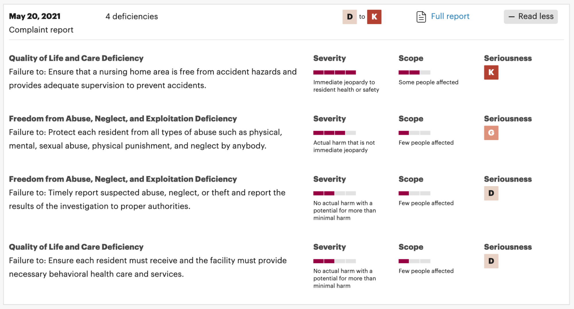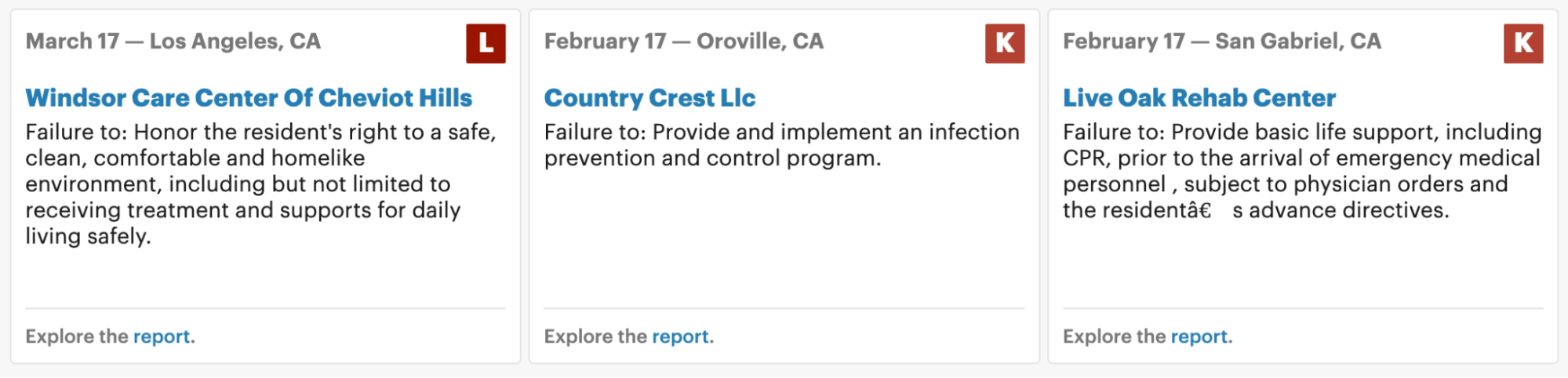 To aid local journalists and others, we’ve added a section to each state or territory’s page highlighting serious deficiencies found in that location, allowing users to quickly identify homes that were recently cited for putting residents in immediate jeopardy. We’ve also added pages where you can see all nursing homes in a given county.