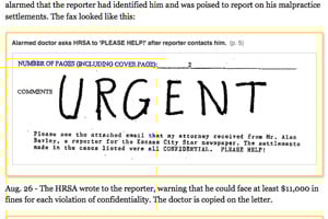 Aug. 24 – The doctor sent a fax to Cynthia Grubbs at HRSA. Tenny asked for help, alarmed that the reporter had identified him and was poised to report on his malpractice settlements. The fax looked like this: