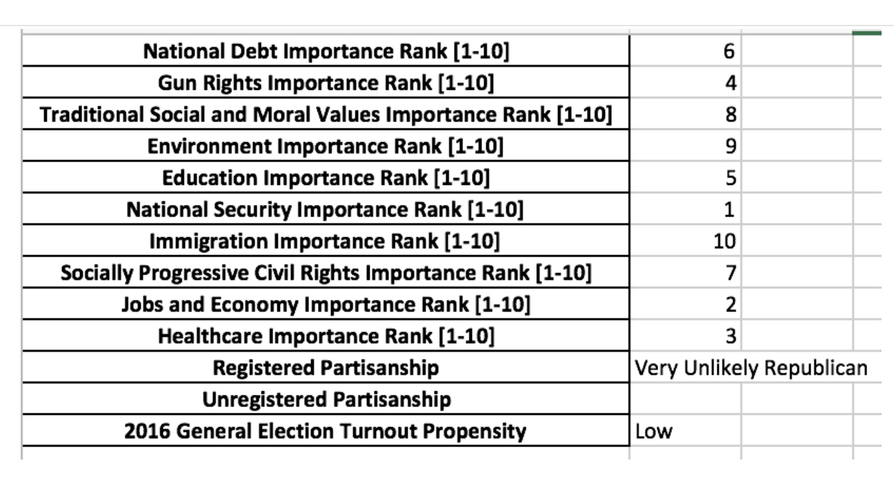 Cambridge Analytica had generated 13 data points about my views: 10 political issues, ranked by importance; two guesses at my partisan leanings (one blank); and a guess at whether I would turn out in the 2016 general election.