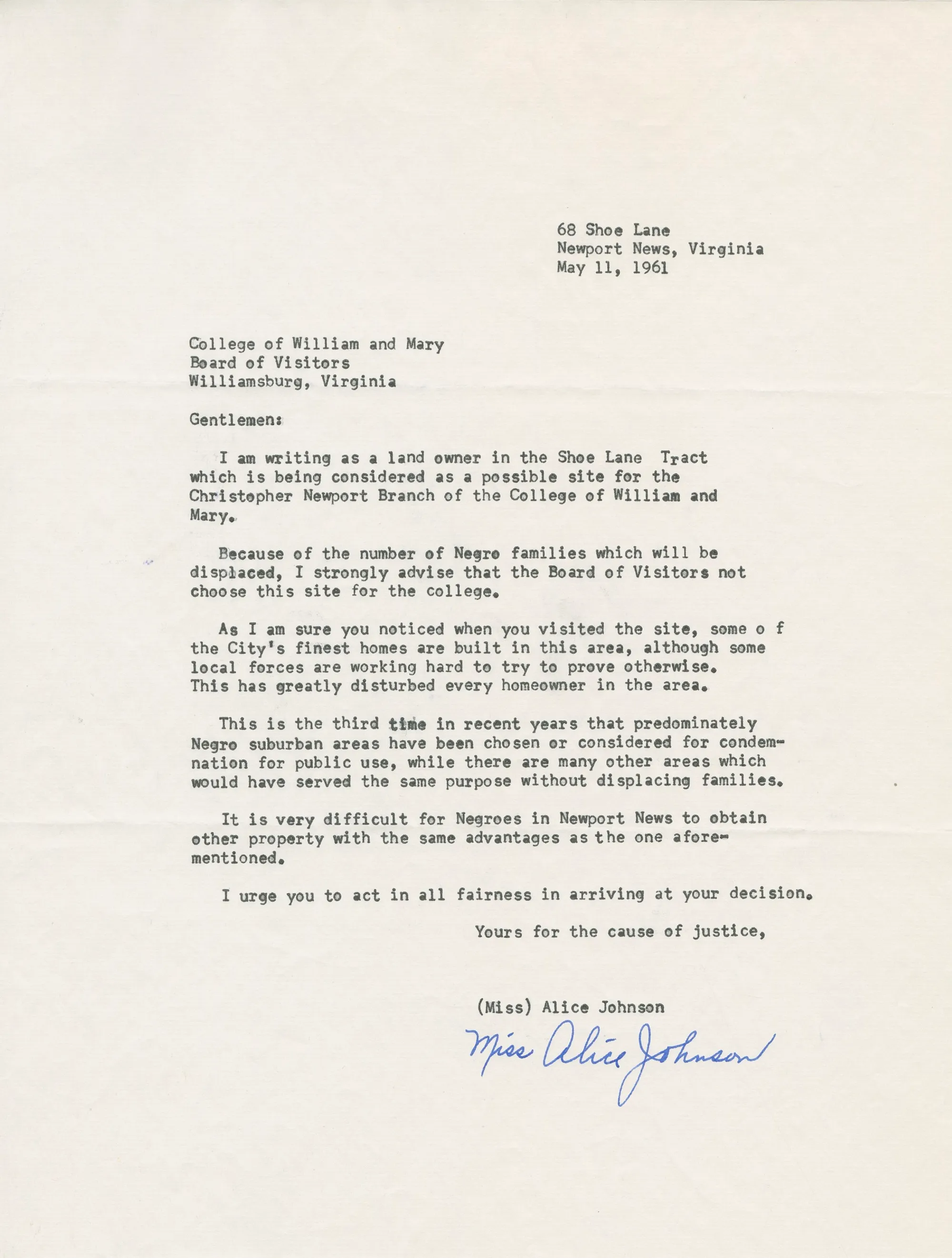 At one point, city councilors said they would rely on guidance from William and Mary’s governing board. The Johnsons pleaded with the all-white board. “Because of the number of Negro families which will be displaced, [we] strongly advise that the Board of Visitors not choose this site for the college,” they wrote. “This has greatly disturbed every homeowner in the area.”
