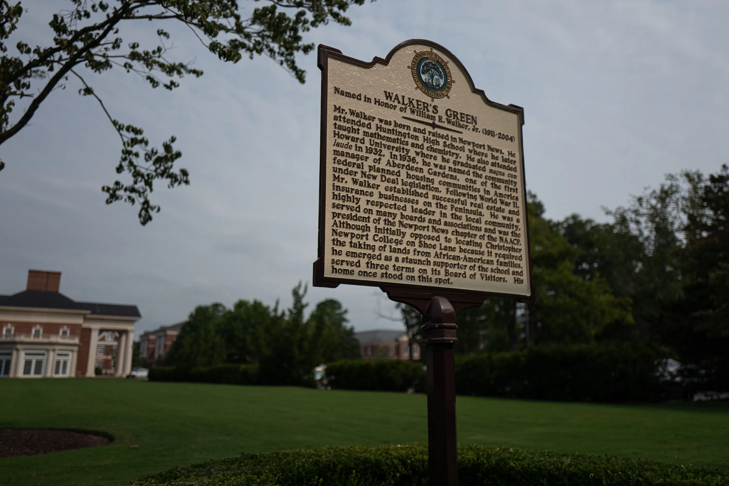The plaque on the site of “Walker’s Green” honors their late neighbor William Walker. Walker was a real estate developer and president of the NAACP’s Newport News chapter. But he also served on Christopher Newport’s board while the school was expanding and the homeowners sued.