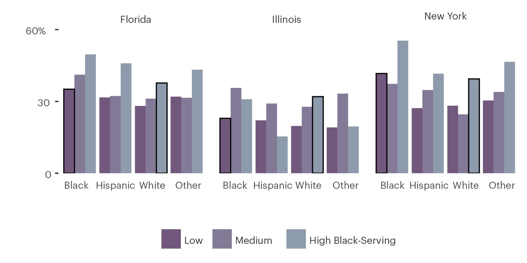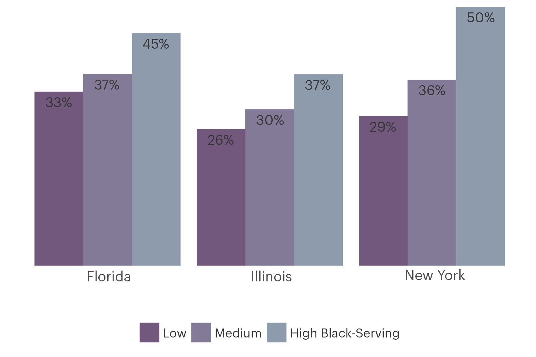 For Illinois and Florida, we clustered the hospitals using Jenks natural breaks optimization with three classification groups. For New York, we grouped the hospitals with the same clustering technique, but with five classification groups (the two highest groups representing “high”), in order to achieve a similar cluster size as the two other states. The number of hospitals in each group and the thresholds for low, medium and high groups varied by state.