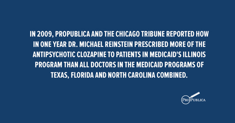 Then, in 2013, as part of a ProPublica investigation into Medicare’s failure to monitor problem prescribers, we reported that Reinstein prescribed even more clozapine in Medicare’s prescription drug program for seniors and the disabled. Medicare continued to let him prescribe in the program even after the U.S. Department of Justice accused him of fraud and Illinois’ Medicaid program suspended payments to him.