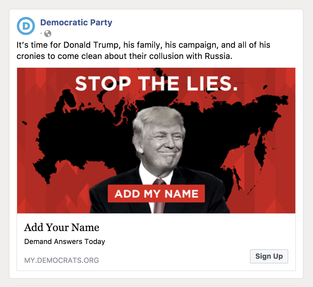 For example, one ad said, “It’s time for Donald Trump, his family, his campaign, and all of his cronies to come clean about their collusion with Russia.” A photo of Donald Trump appeared over a black and red map of Russia, overlaid by the text, “Stop the Lies.” The ad urged people to “Demand Answers Today” and “Sign Up.”