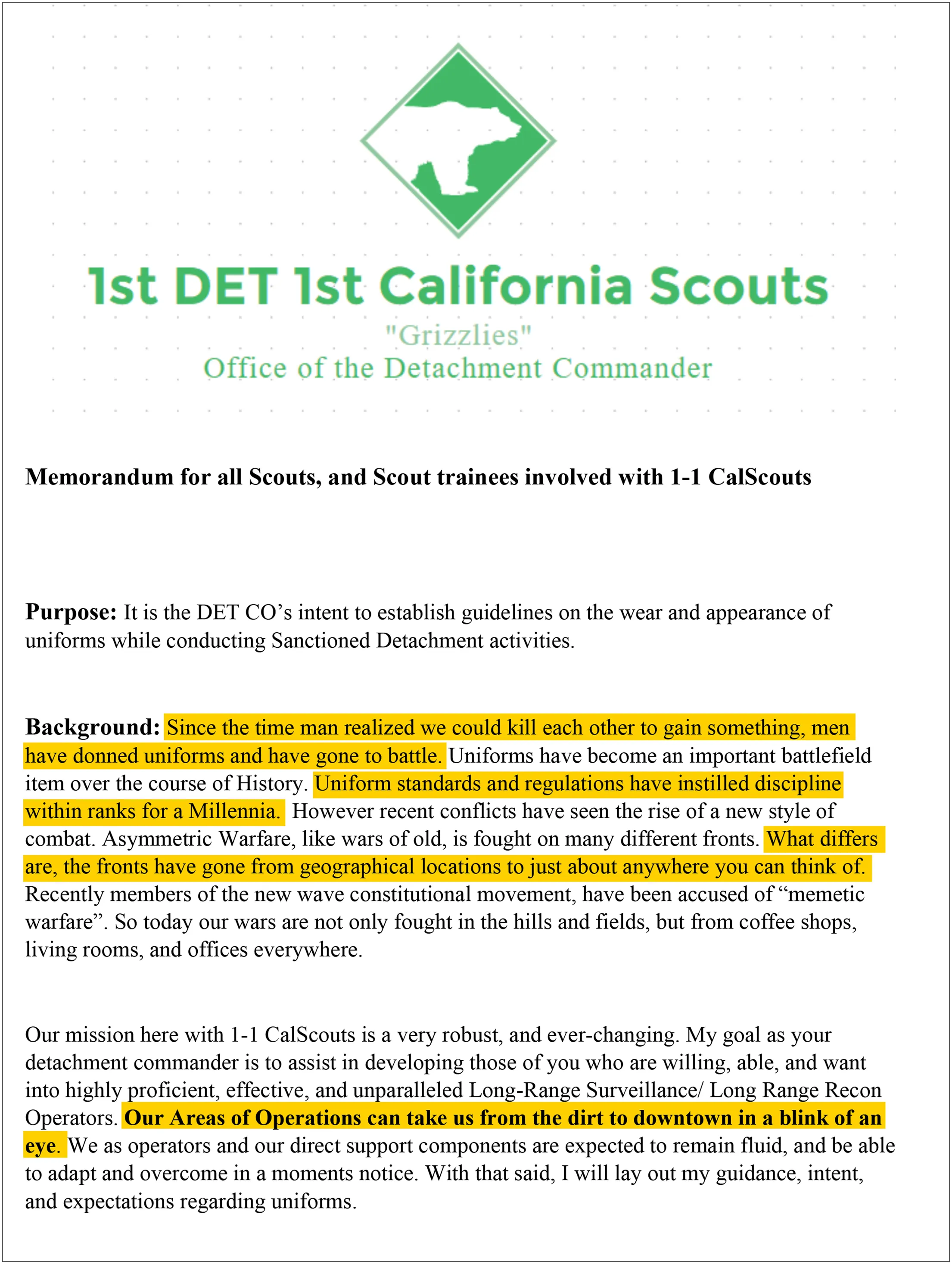 At the same time, the documents make clear that the Grizzly Scouts intended to do more than simply meet up in the woods for occasional target practice. A policy on the Grizzly Scouts’ dress code begins this way: “Since the time man realized we could kill each other to gain something, men have donned uniforms and have gone to battle.” The documents, which describe the Grizzly Scouts as an “armed Constitutional militia,” go on to decree that black will be worn “while conducting covert/clandestine operations,” and stress the importance of wearing approved Grizzly Scout uniforms “to mitigate any potential battlefield confusion.”