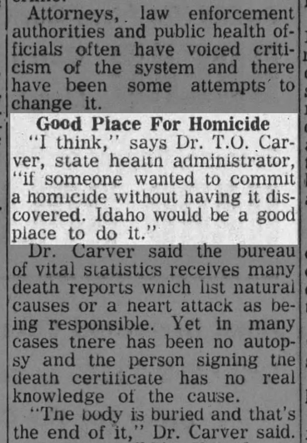 Dr. T. O. Carver, state health administrator at the time, told The Associated Press, “I think … if someone wanted to commit a homicide without having it discovered, Idaho would be a good place to do it.” Carver praised Oregon’s medical examiner system and said changing Idaho to a similar setup would cost more, but it would yield evidence and truth.