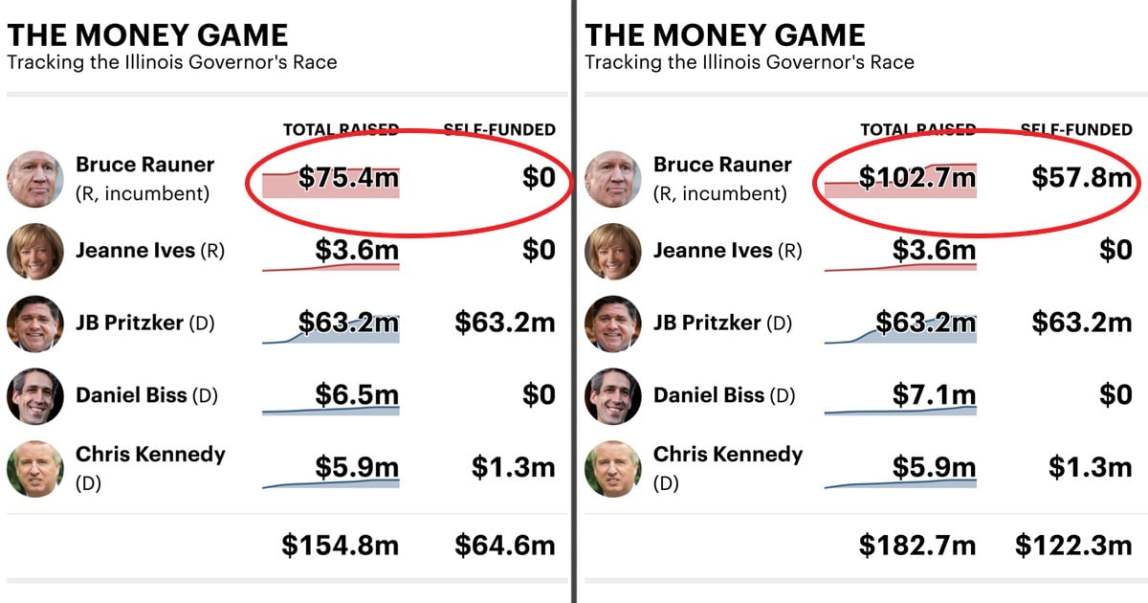 In the first, which looks at fundraising dating to Jan. 1, 2017, Gov. Bruce Rauner shows no self-funding. That’s correct: The Republican incumbent didn’t donate any money to his campaign in 2017 or the first two months of 2018.