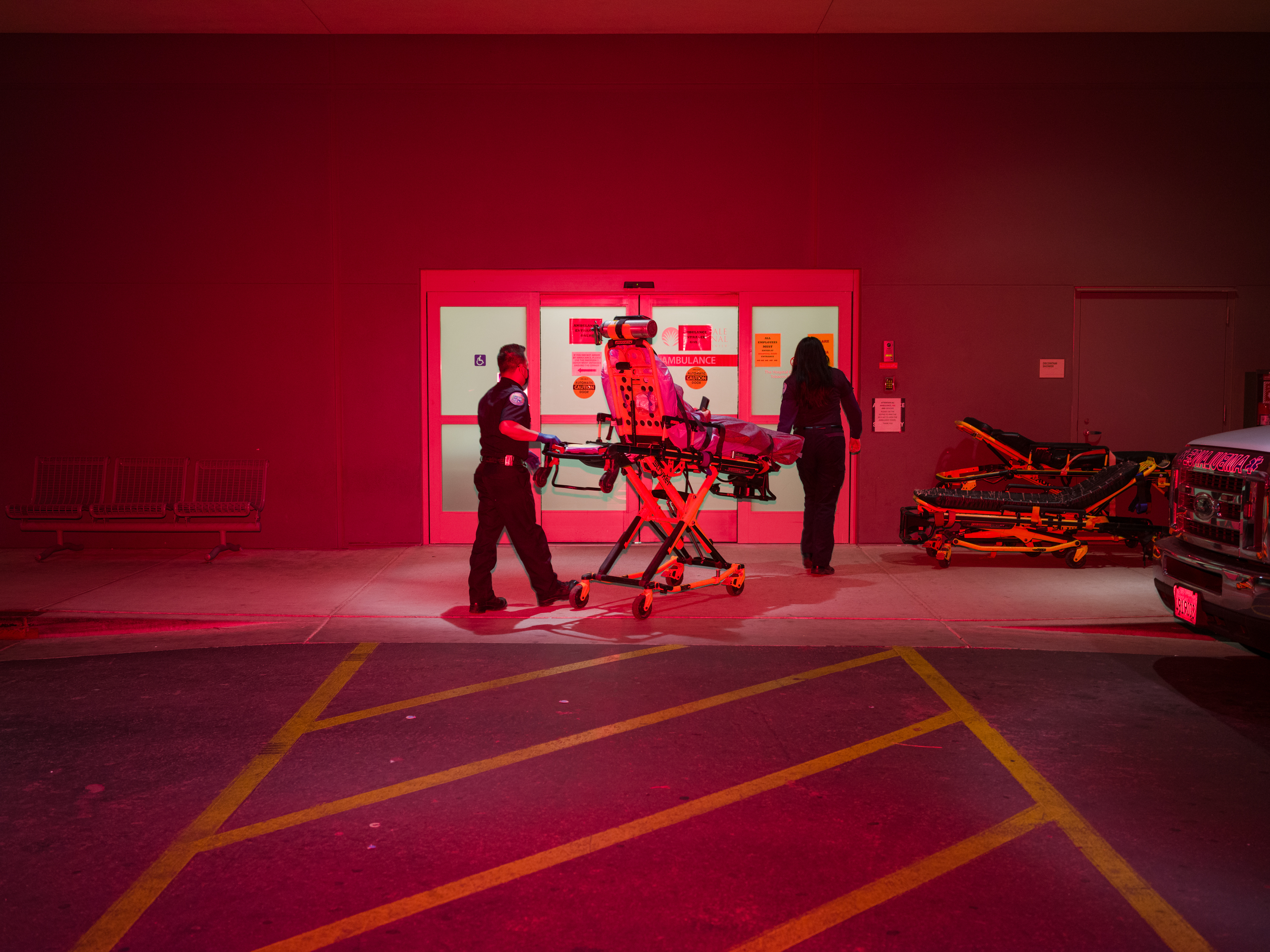 Ten minutes later, as he swung left into Antelope Valley Hospital, Diaz was dismayed to note the first signs of gridlock: Five ambulances were already parked in the bay. Diaz and Sanchez wheeled their patient toward the back entrance of the emergency department, where they joined a phalanx of other gurneys. A mother and her crying infant. A man whose legs had swollen up like the limbs of a balloon animal. A woman whose wrists were in restraints. She’d spat at the EMTs who’d brought her in and, because they couldn’t find a mask, they’d placed a white napkin over her face. “It looks like it’s one of those days,” Diaz said.