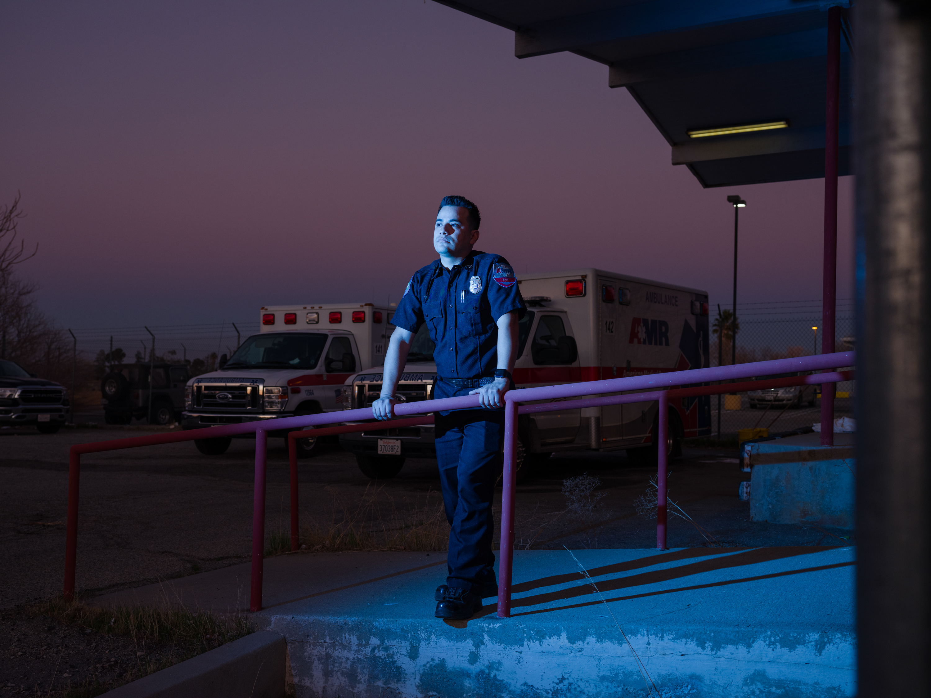 It was 4:32 p.m. and Mike Diaz was almost halfway through another punishing 24-hour shift when the call came over the ambulance radio. Nine miles away, a man had lost consciousness. “We’re en route from Palmdale Regional,” Diaz told the dispatcher, pushing away the thought of grabbing some food, as he flicked on the lights and sirens and sped off into the suburban maze of the Antelope Valley. He had worked as an emergency medical technician here in the northernmost part of Los Angeles County for over a decade, but he still experienced the same thrum of adrenaline on urgent calls. Lately, however, on January afternoons like this one, his excitement was overpowered by a sense of futility and dread.