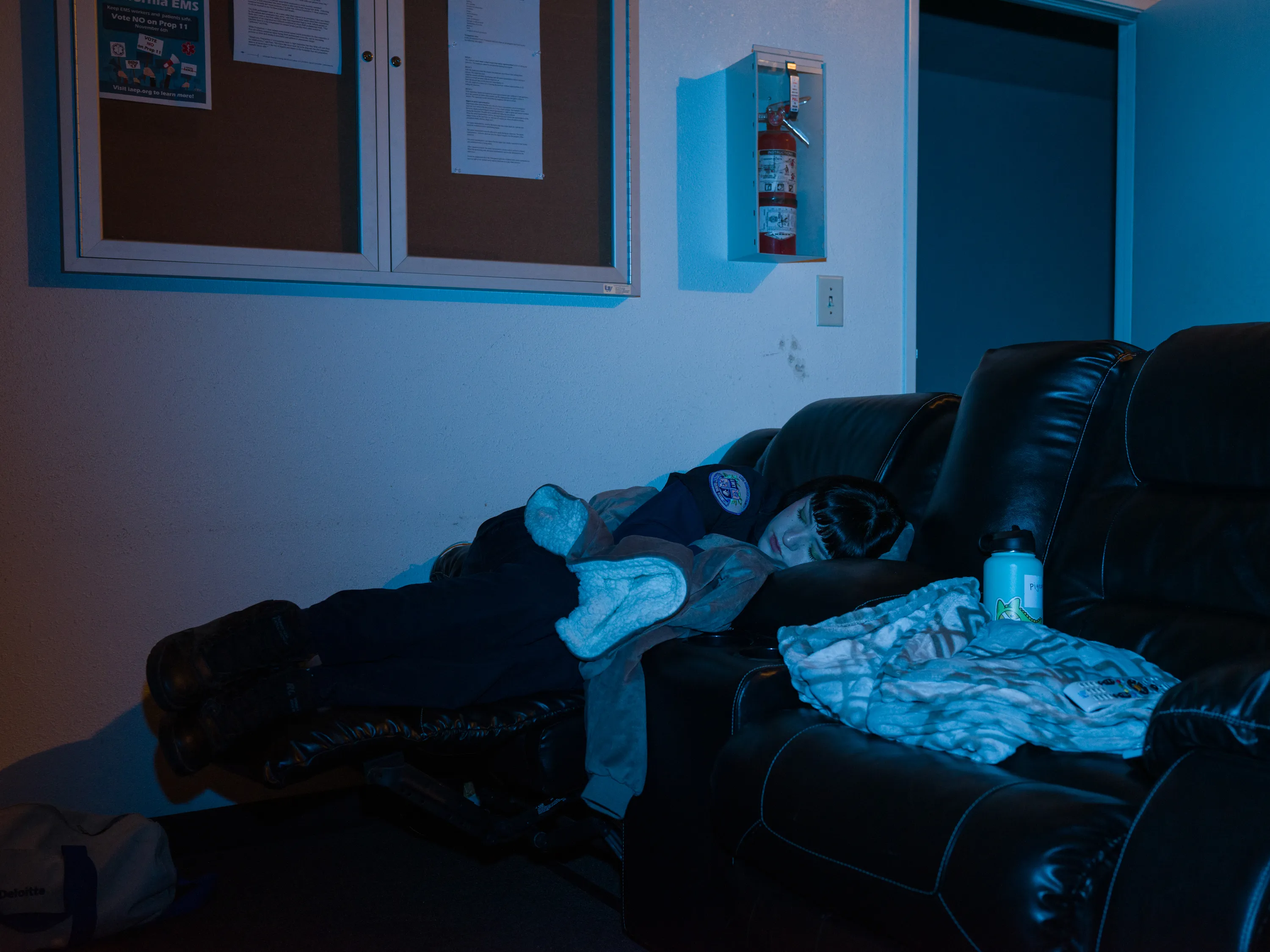 No sooner had Diaz shut the metal door to Station 104 than he heard the familiar ring of a call dropping in over the radio — a two-toned descent, like a drawn-out doorbell. “Ugh,” he sighed. “That sucks.” He and Sanchez had just returned to the station after finally offloading their 88-year-old patient into a bed at Antelope Valley Hospital. It had taken over two hours, and the jolt of excitement he’d felt earlier that afternoon had long since dissipated.
