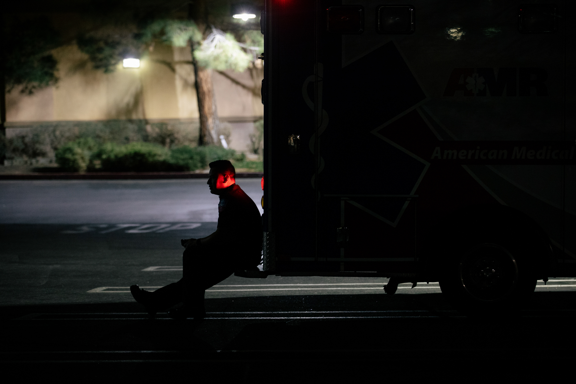 As the sun set on Antelope Valley Hospital, more EMT crews arrived, joining Sanchez and Diaz on the wall. They exchanged mordant greetings.