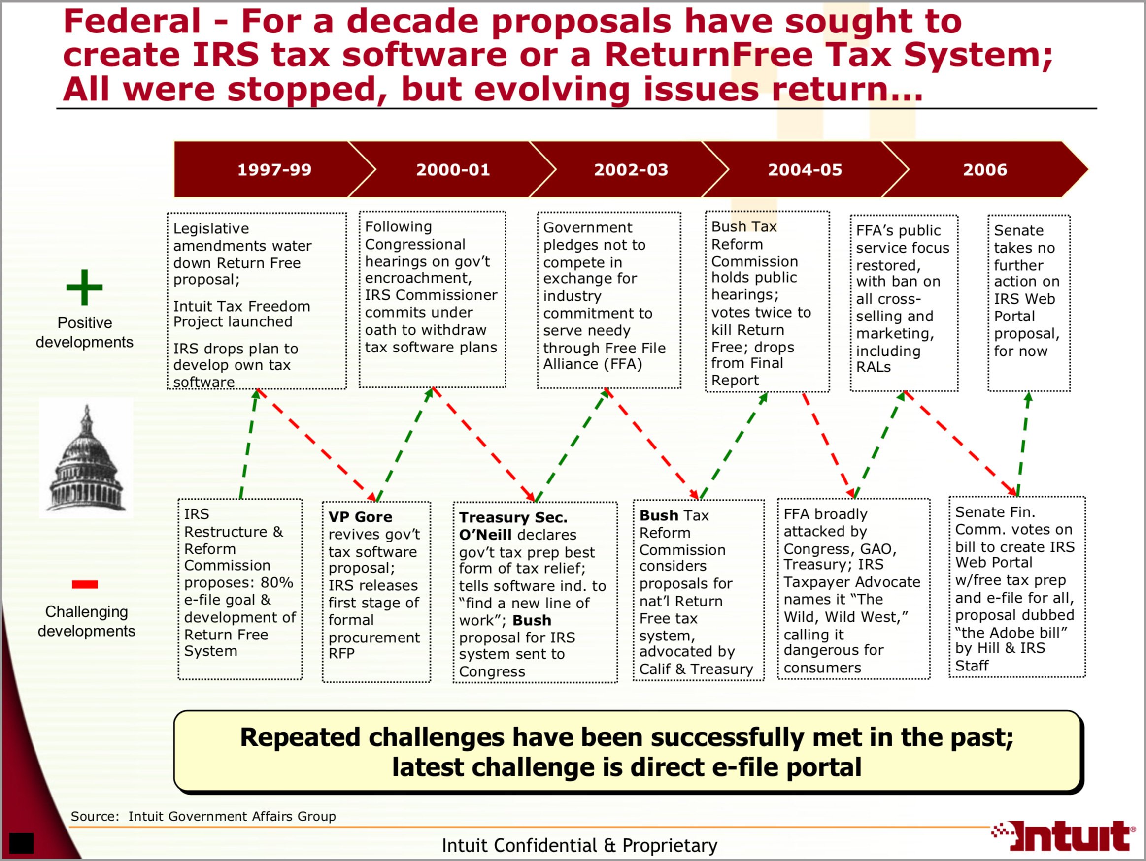The danger to Intuit’s growing business was obvious. If the government succeeded in creating a system that allowed the vast majority of taxpayers to file online for free, TurboTax profits would plummet. Intuit recognized that the notion of “return-free filing” was not going away on its own.