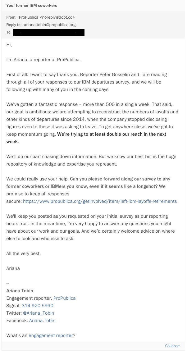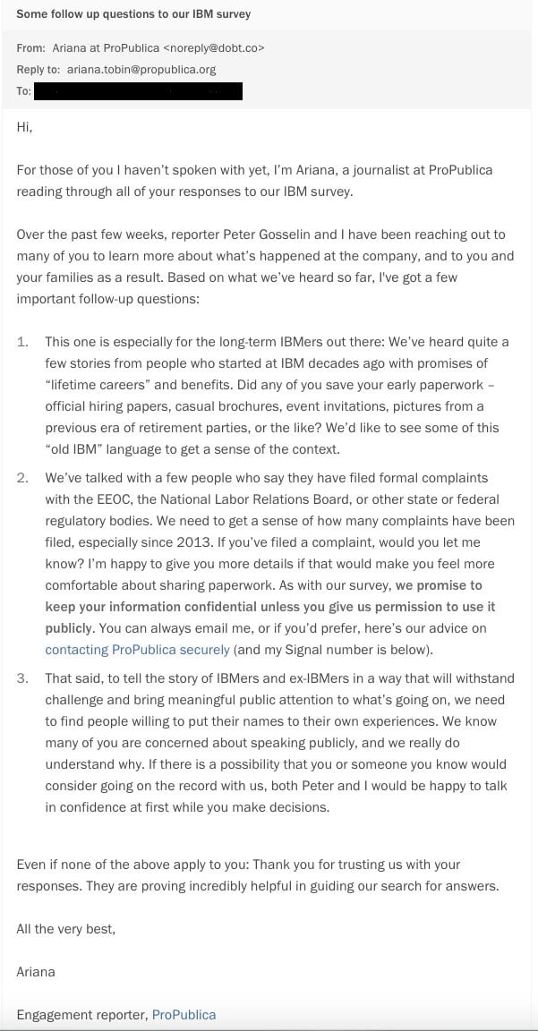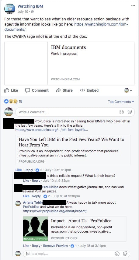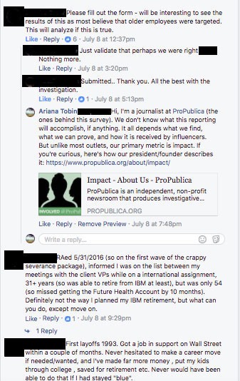 We decided to reach out to the page’s administrator, who was a longtime IBM workplace activist, Lee Conrad. He shared our age discrimination questionnaire in the group and more responses poured in.
