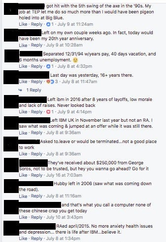 Another wrote: “Part of the separation agreement was that I not seek collective action against IBM for age discrimination. I was not going to sign as a law firm was planning to file a grievance. However they needed 10 people to agree and they could not get the numbers.”