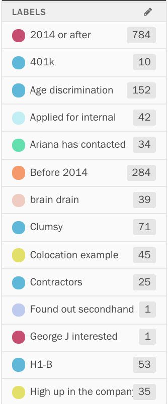 Eventually, we also created a category called “legal action.” We’d stumbled upon support groups of ex-IBM employees who had filed formal complaints with the Equal Employment Opportunity Commission. Some sent us the company’s responses to their individual complaints, giving us insight into the way the company responded to allegations of discrimination. These seemed, of course, very useful.