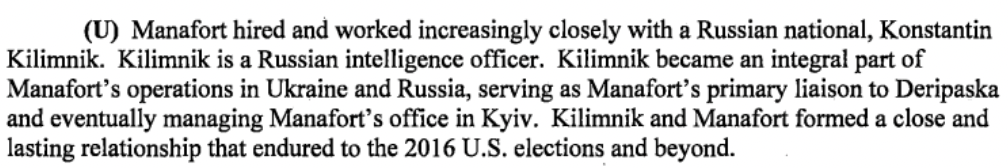 According to the Senate report, Manafort met Kilimnik twice in person while working on the Trump campaign, messaged with him electronically and shared “sensitive campaign polling data” with him.