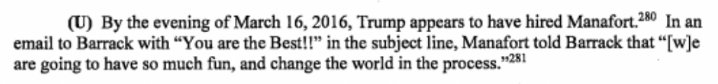 According to the Senate report, in mid-May 2016 he emailed top Trump fundraiser Tom Barrack, “We are going to have so much fun, and change the world in the process.” (Barrack was charged last year with failing to register as a foreign agent, involving his work for the United Arab Emirates. He has pleaded not guilty. The case has not yet gone to trial.)
