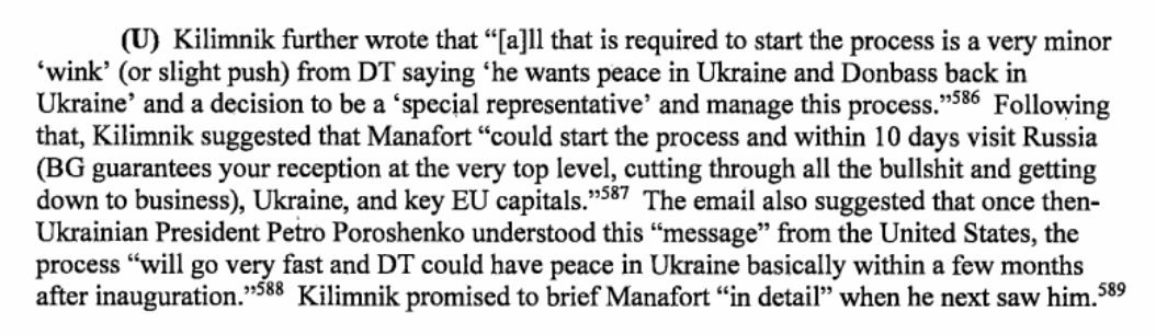 After Trump won the election, the Senate report says, Manafort and Kilimnik worked together on a proposed “plan” for Ukraine that would create an Autonomous Republic of Donbas in separatist-run southeast Ukraine, on the Russian border. Manafort went so far as to work with a pollster on a survey on public attitudes to Yanukovych, the deposed president. The plan only would need a “wink” from the new U.S. president, Kilimnik wrote to Manafort in an email.