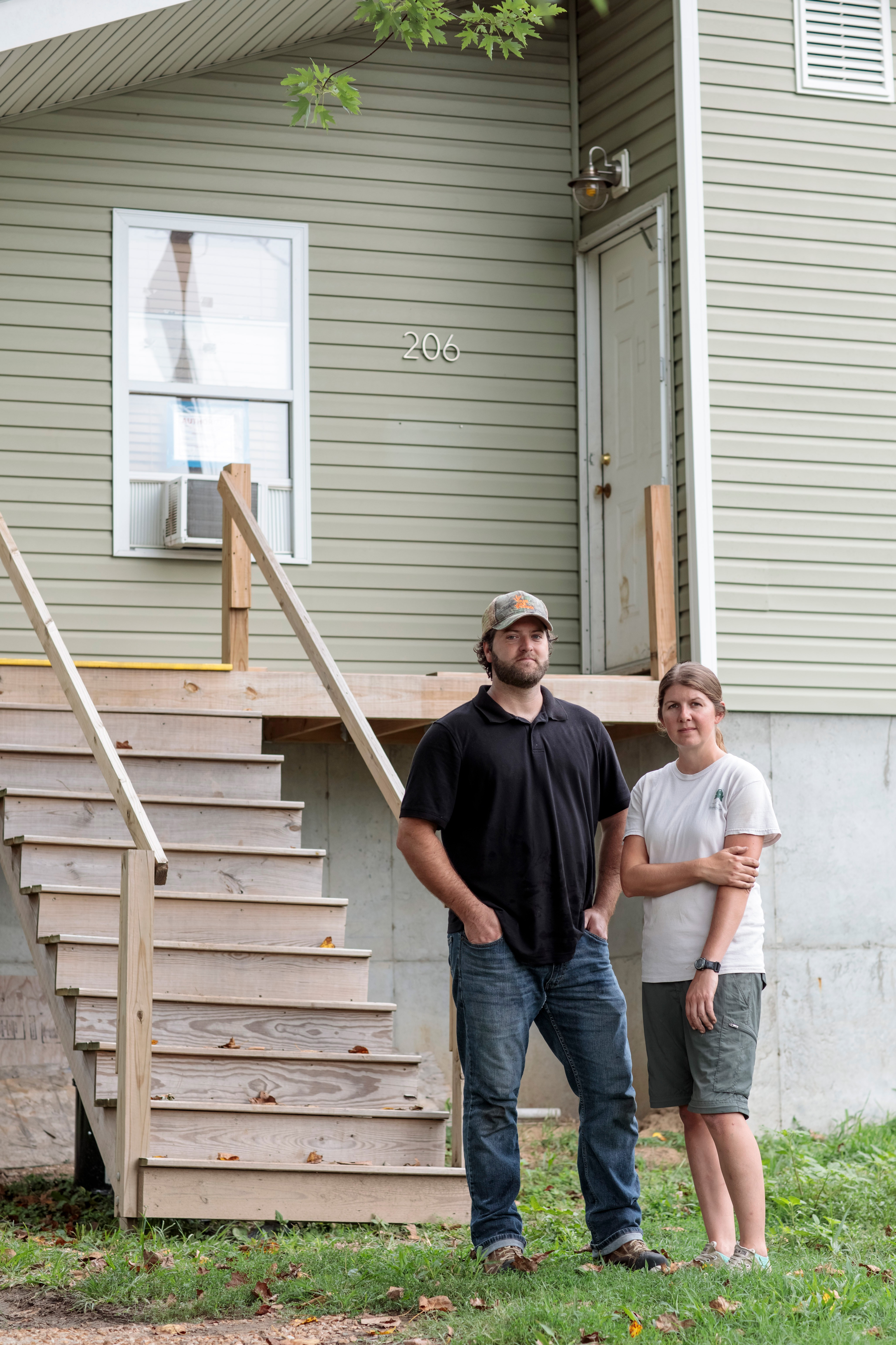 Four months after the 2015 flood, Devin Brundick and Felicia Ammann set about elevating their home in Pacific. They had an 8-foot concrete foundation poured, then had a crane pick up their little green house and set it on top. It was another year before they could move back in. Brundick is a carpenter, and when he has time at home, he works on finishing repairs.