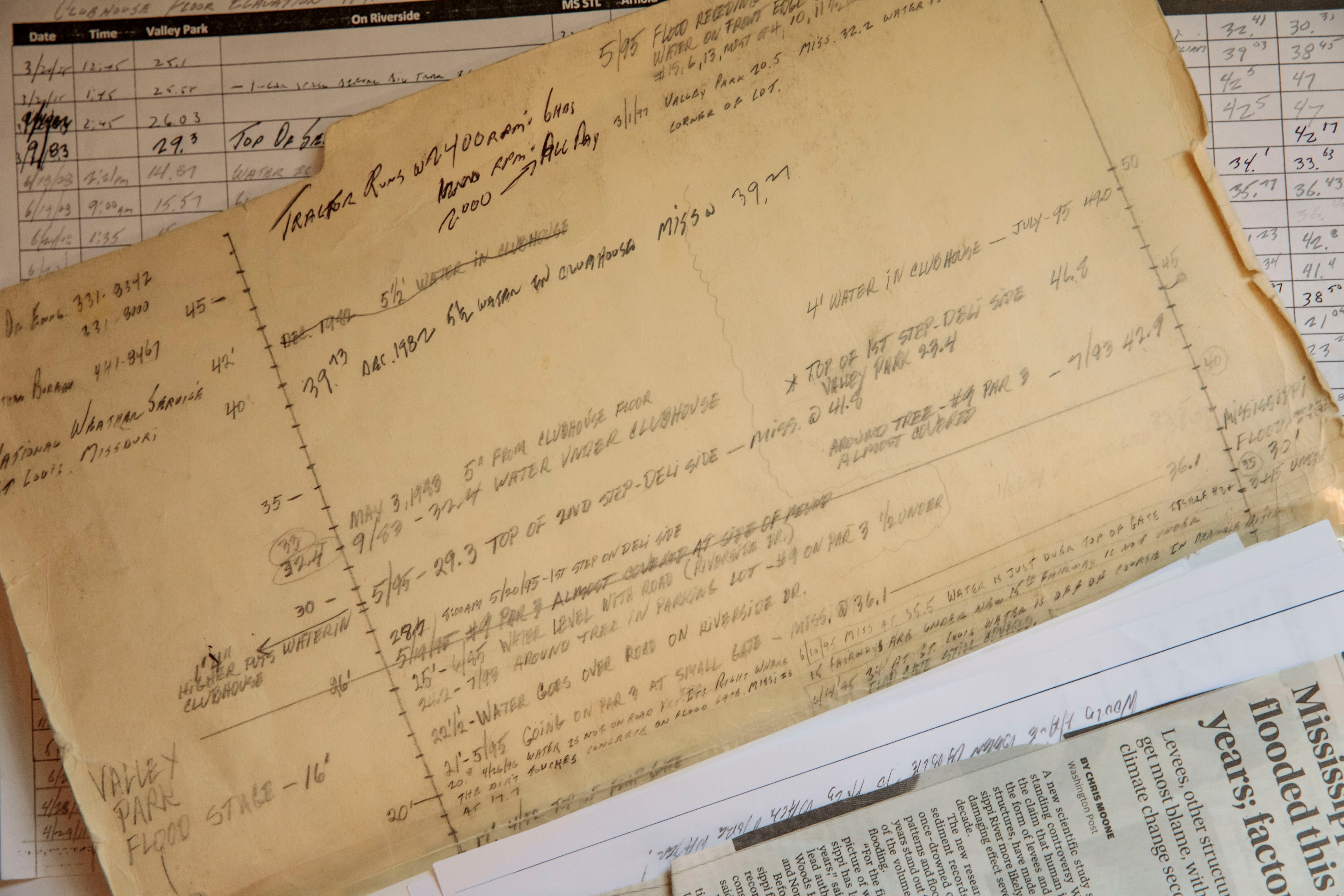 At the time, Walt Wolfner was in high school and already the manager of his father’s golf course in Fenton. With the course submerged, Wolfner’s father began a tradition that Wolfner continues today: jotting down the height of the Meramec from nearby stream gauges along with its impact on the course. He logged the river’s height in Valley Park at 39.73 feet. Beside it, he wrote, “5 1/2 [feet] water in clubhouse.”