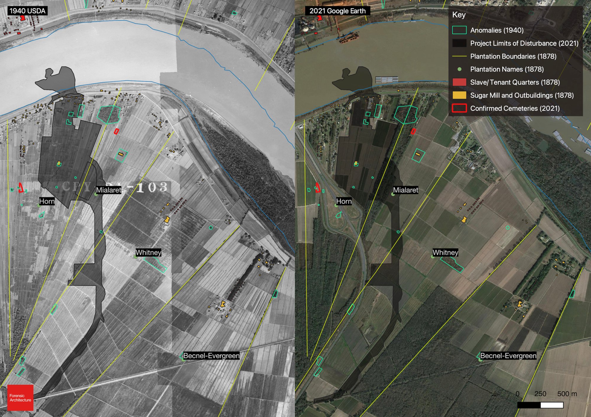The letter cited work by a research firm called Forensic Architecture, based at Goldsmiths’ College at the University of London, that had been investigating the location of historic cemeteries in Cancer Alley, the predominantly African American region between Baton Rouge and New Orleans that’s packed with dozens of petrochemical plants and refineries. Using historic maps and aerial photographs, they’ve identified geological anomalies that could indicate burial sites, including trees growing in otherwise-cultivated fields. In some cases, those anomalies took root because plows or planters had long steered clear of known or suspected locations of graves.