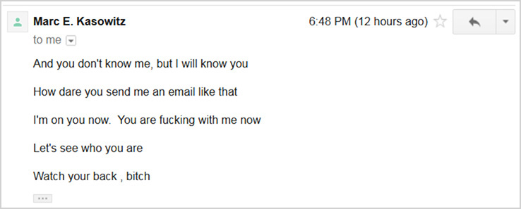 The man told us that the email exchange disturbed him so greatly he forwarded it to the FBI so there would be a written record in case Kasowitz followed through on the threat.