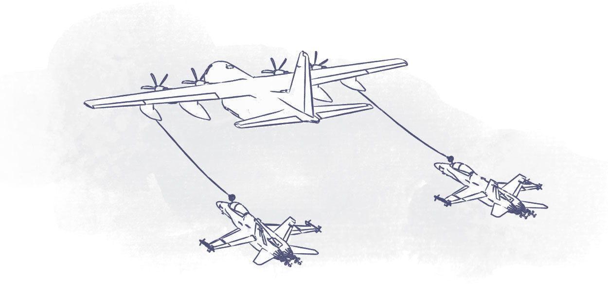 The second Hornet had connected to the tanker’s other fuel hose. As the gas poured in at a rate of hundreds of gallons a minute, the three Marine Corps aircraft turned a wide, careful oval inside the safety of their approved airspace.