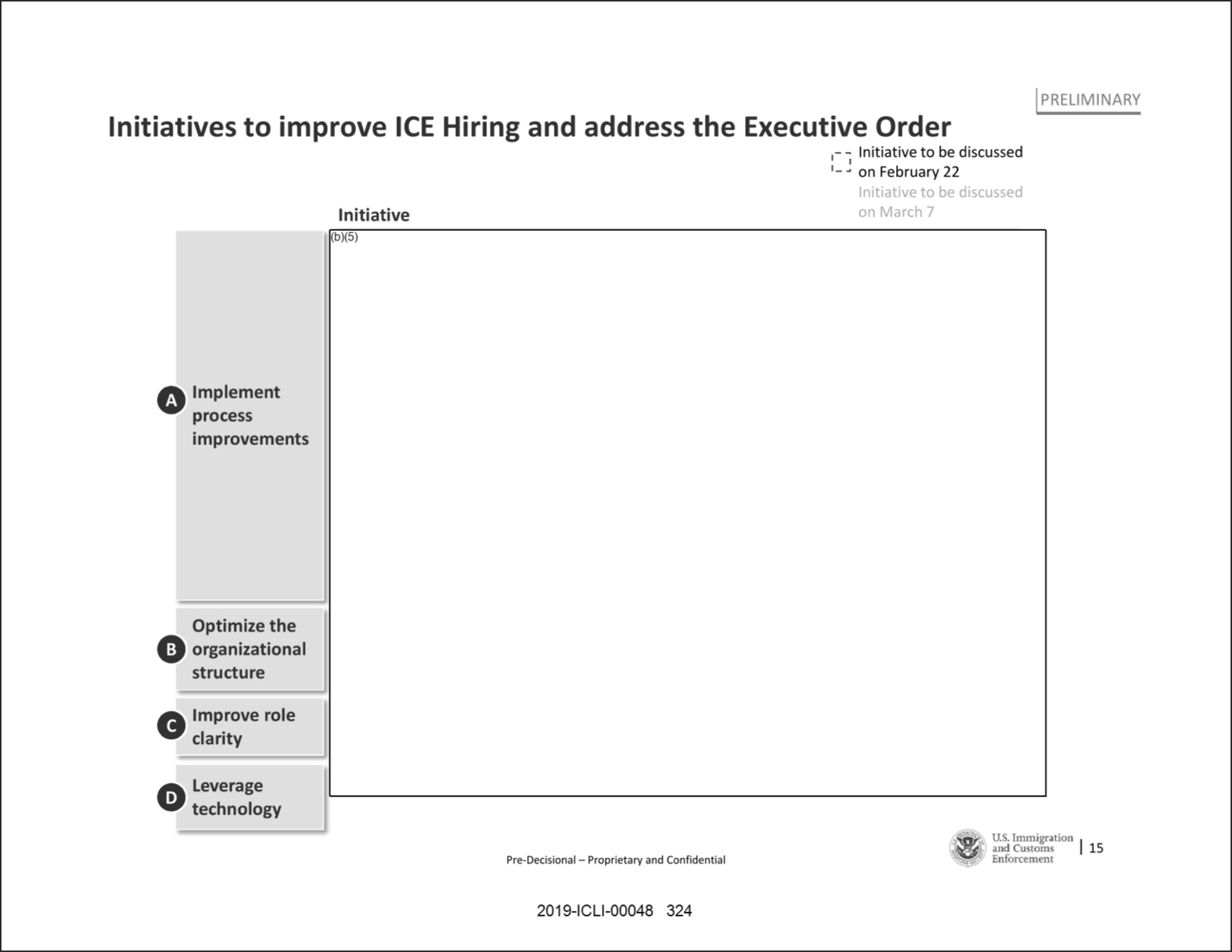 But documents, corroborated by people who worked on the project for McKinsey and for ICE, show that this claim is misleading. For example, two McKinsey slides, presented below, show that the firm’s hiring work was reoriented toward helping ICE comply with Trump’s executive order directing the agency to hire 10,000 immigration officers. One is titled “Initiatives to improve ICE Hiring and address the Executive Order.” The other is titled “The hiring system can work better and meet additional hiring needs brought on by the Executive Order.”