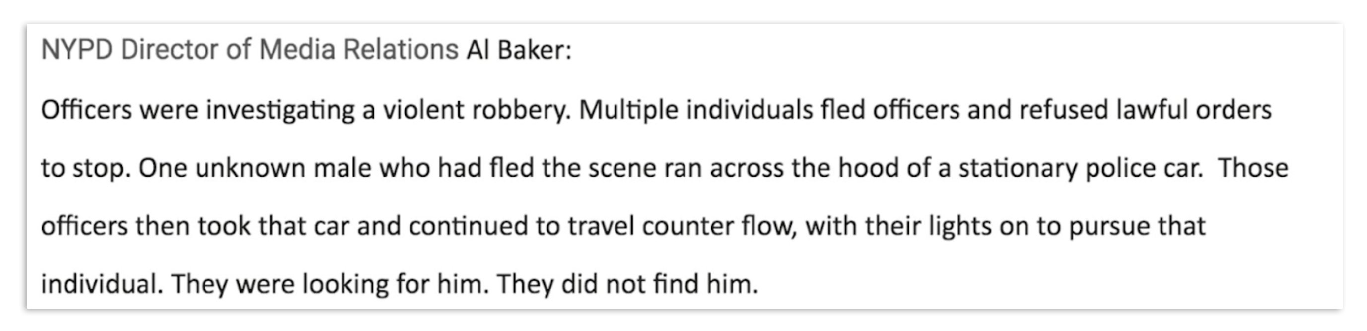 I felt a sense of kinship with the NYPD’s spokesman, Al Baker. He’s a former journalist. We followed each other on Twitter. Surely, he’d tell me the real deal.
