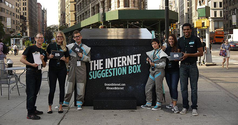 The boxes, sometimes accompanied by young people in futuristic costumes, have been popping up on both coasts for weeks, soliciting messages of support – but their sponsor has been a mystery. The web site for the campaign, Onward Internet, does not say. Their domain registration is private. And the site includes no contact information, only an animated video heavy on millennial lingo: “The internet was made to move data…we got blogs, likes, selfies and memes, OMG, BRB and TTYL.”
