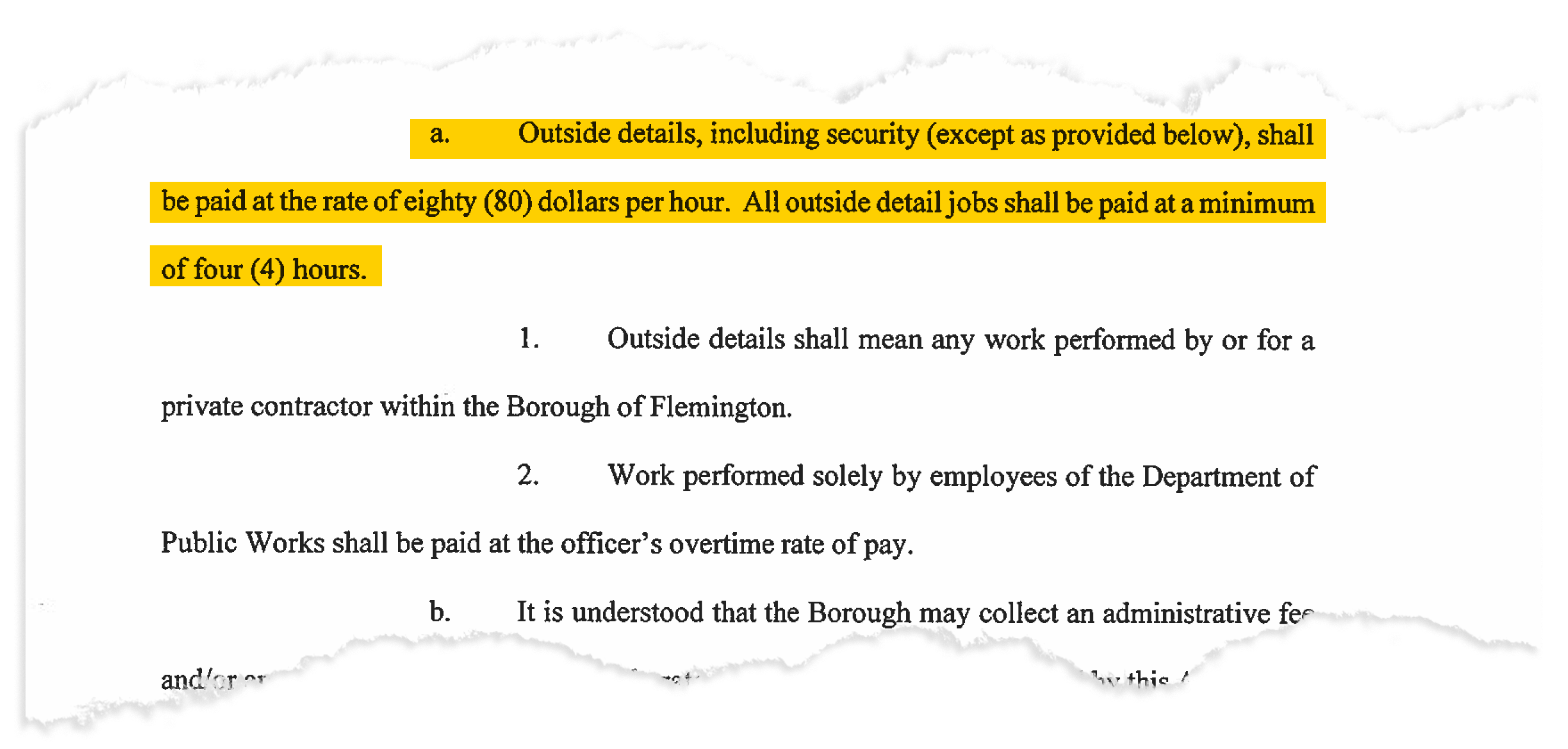 Flemington borough’s current contract, effective from Jan. 1, 2020, to Dec. 31, 2022, guarantees that officers will be paid for a minimum of four hours on all extra duty jobs.