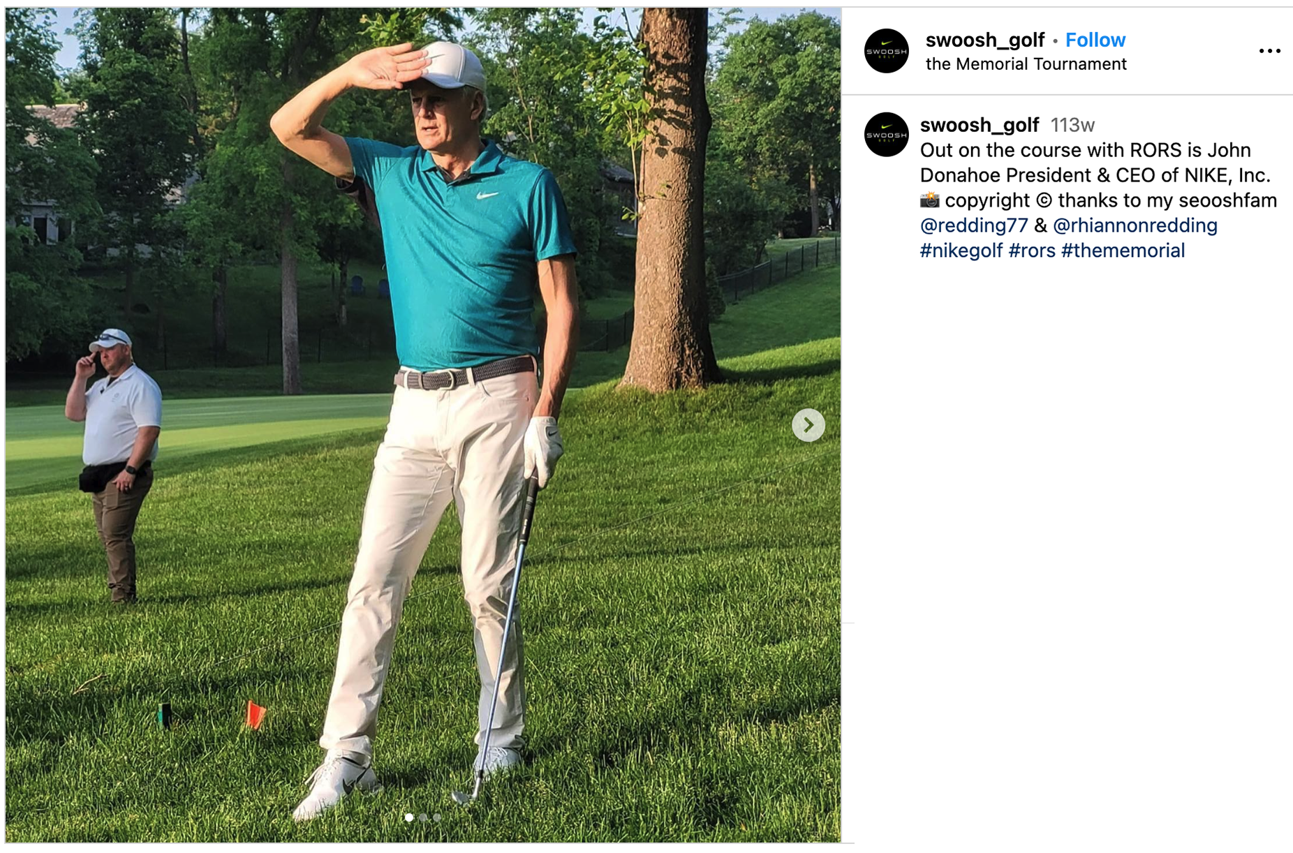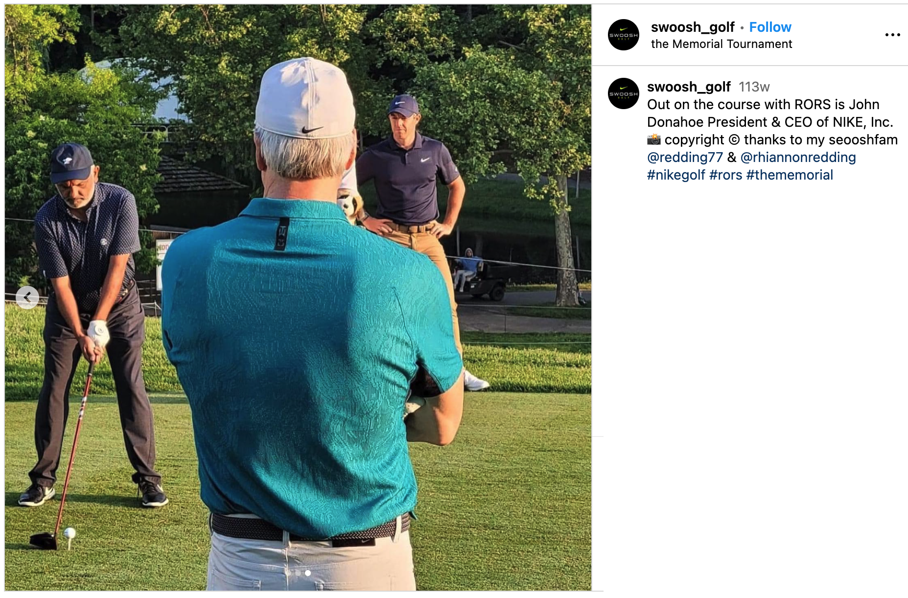 In 2022, Donahoe golfed in a morning pro-am event before the Memorial Tournament at Muirfield Village Golf Club, outside Columbus, Ohio. Social media photos show Donahoe playing with Rory McIlroy, a golf star Nike sponsors.