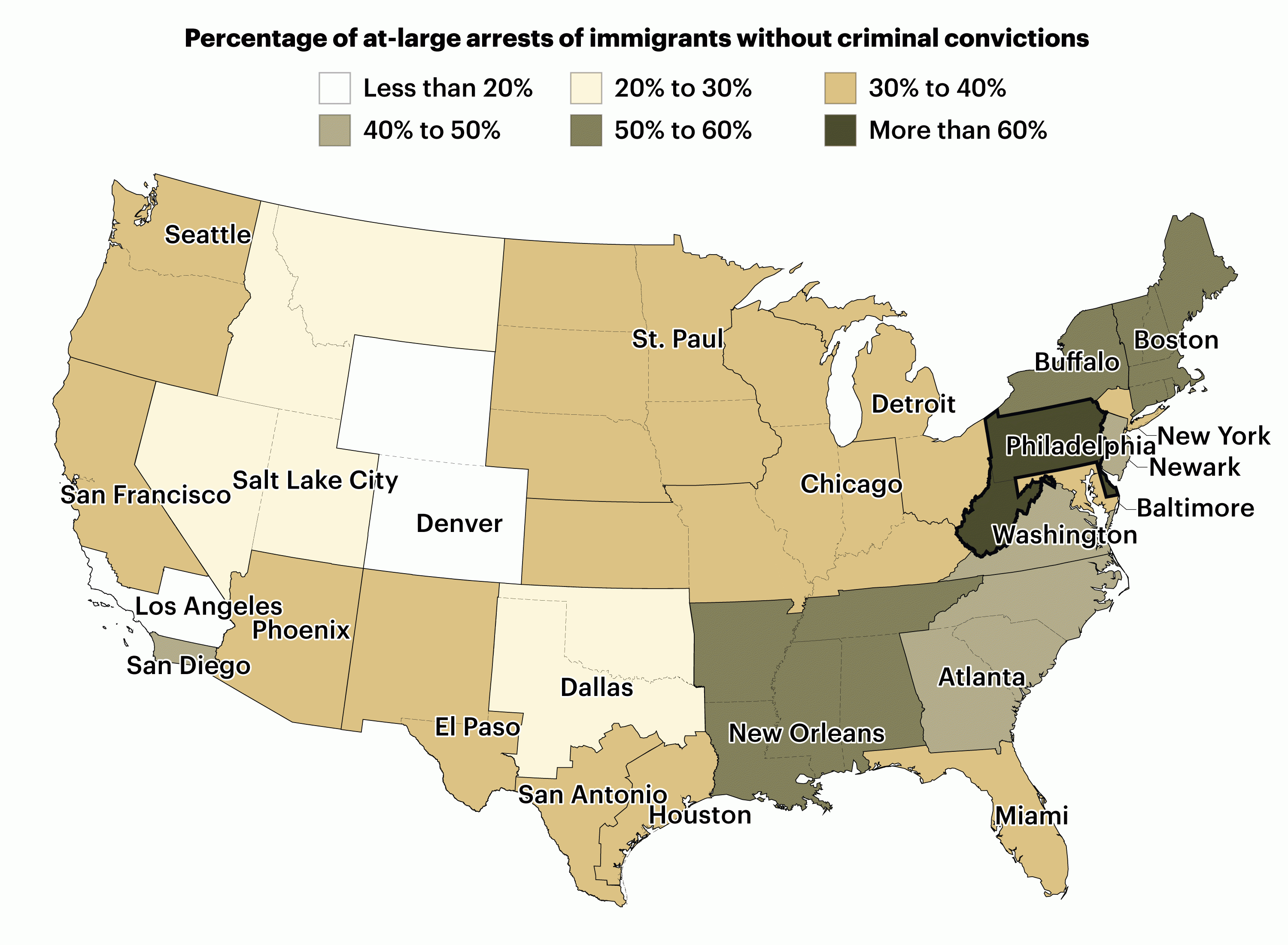The Philadelphia ICE field office arrests more immigrants without criminal convictions than any other ICE region: 64 percent of its “at-large” arrests last year. The office oversees ICE enforcement in Pennsylvania, Delaware, and West Virginia. Nationally, 38 percent of those arrested had no criminal convictions.